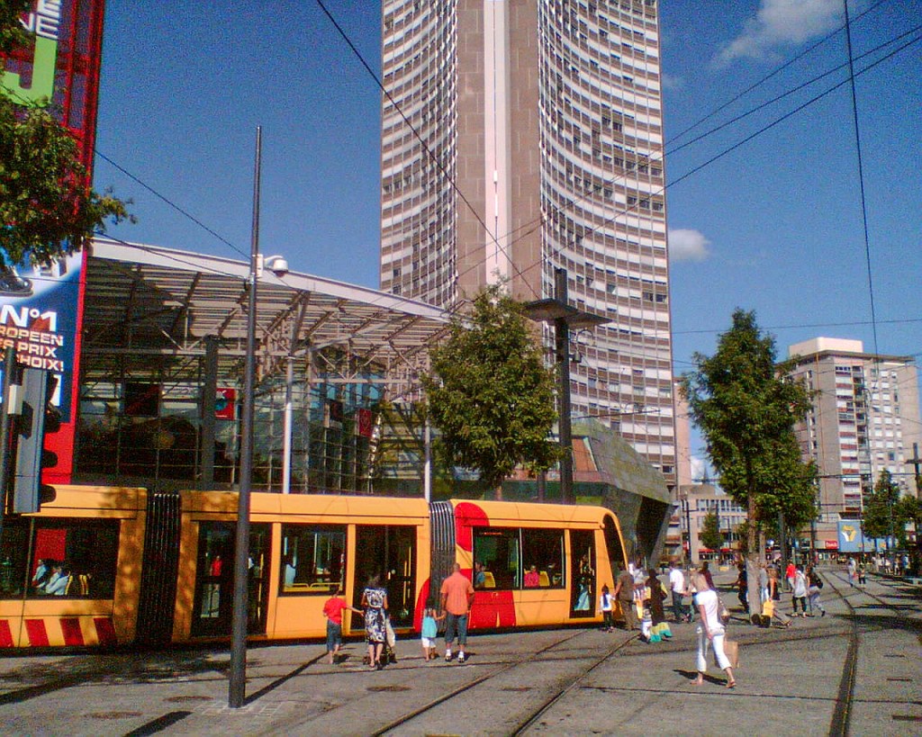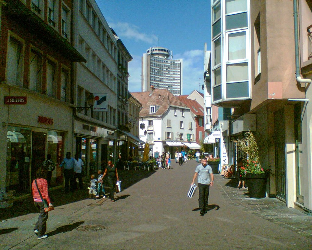 Die vielen Impressionen zum Textildruck konnten wir beim anschließenden Stadtrundgang ein wenig sacken lassen. Sebastian und Nawel führten mit ausgewählten Häppchen an Informationen zu den architektonischen Besonderheiten von Mulhouse: dem „Bâtiment annulaire“ (Ringhaus), einem runden Wohnblock mit einem kleinen Park in der Mitte, dem Europaturm („Tour de l’Europe“), der mit seinen Seiten nach Deutschland, Frankreich und der Schweiz ausgerichtet ist und wiederum die Internationalität der Stadt symbolisiert sowie den Renaissance-Fassaden an der „Place de la Réunion“ und dem (protestantischen) „Temple Saint-Étienne“.